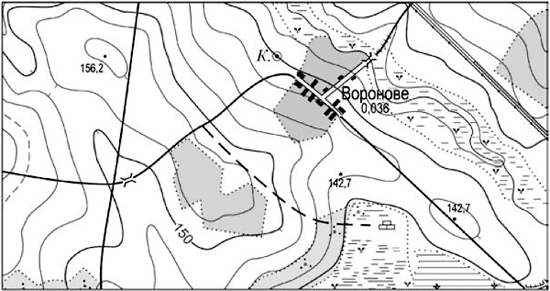 На топографічній карті виміряли відстань між двома заданими точками, одна з яких розташована на околиці села Воронове, а друга - на перехресті автомобільних доріг. Відстань між цими точками зіставлено з лінійним масштабом (див. рисунок). Визначте, якою буде ця відстань (у метрах) на місцевості.