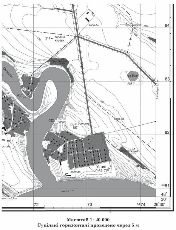 Визначте відносну висоту вершини гори Устинка щодо урізу води в річці Смотрич (у метрах).
