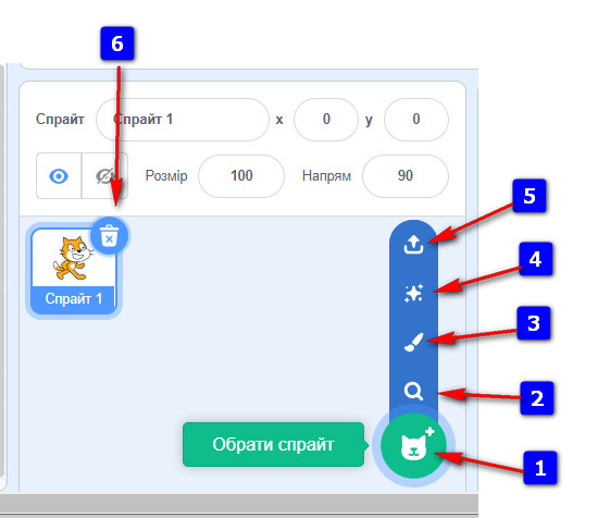 На малюнку зображено фрагмент інтерфейсу середовища програмування Скретч для роботи з об’єктом. Якою цифрою позначено інструмент для видалення об’єкта?