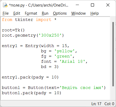 Написано текст програми для створення проєктів з вікнами, кнопками, написами, полями, подіями та їх обробниками. Яка установлена ширина поля?