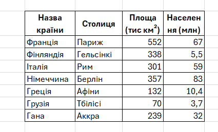 ((Назва країни = У*) OR (Площа>=350)) AND (Населення>=50)