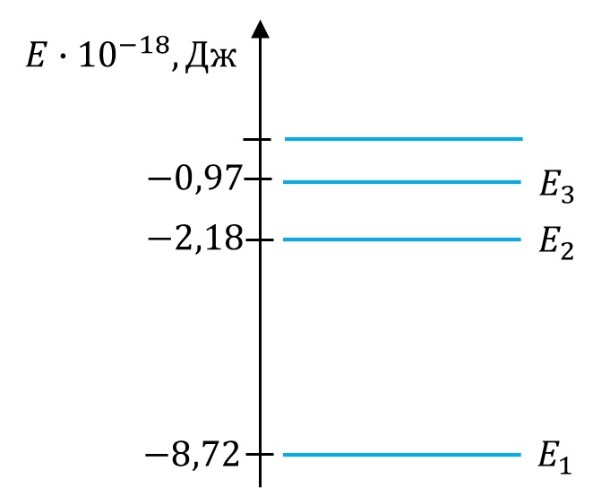 Припустимо, що схема енергетичних рівнів атомів розрідженого газу має вигляд, як показано на рисунку. У початковий момент атоми перебувають у стані з енергією Е1. Фотони з якою енергією може поглинати газ при переході на інший енергетичний рівень?