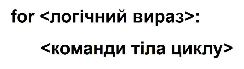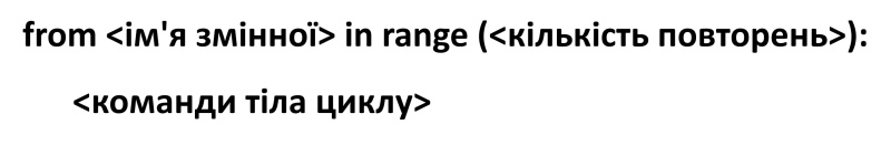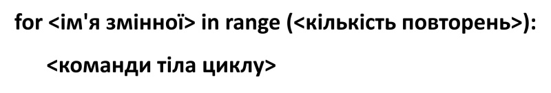 Загальний вигляд команди циклу з лічильником у мові Python має такий вигляд