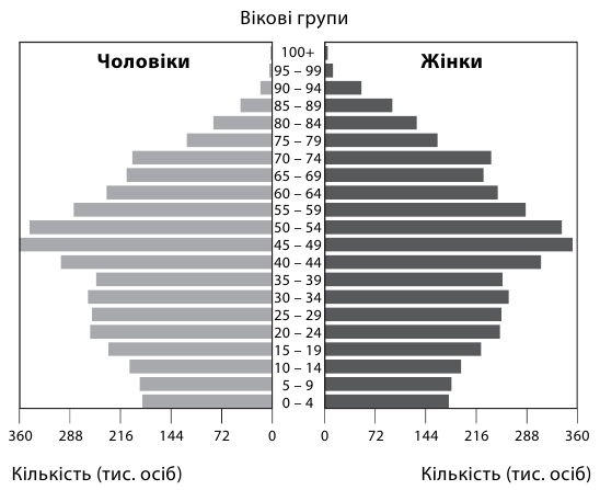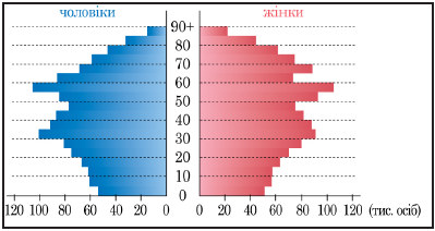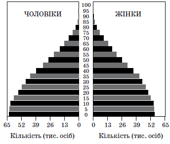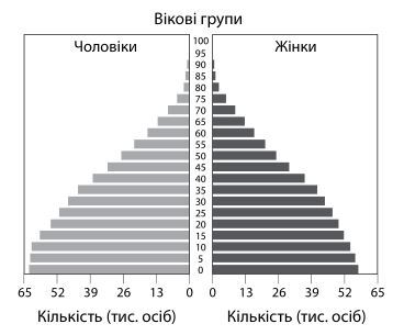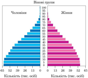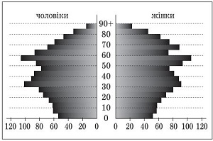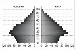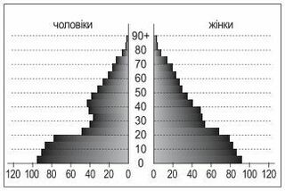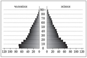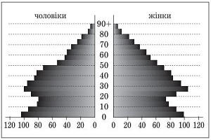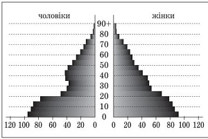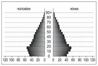 Проаналізуйте статево-вікову піраміду однієї з країн світу. Визначте характерні для цієї країни процеси.