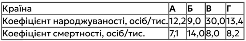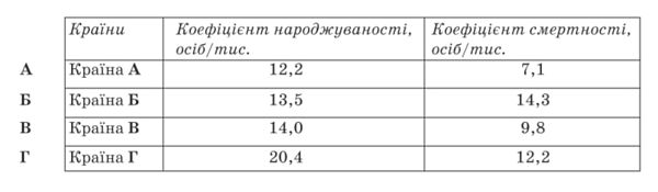 Проаналізуйте наведені в таблиці коефіцієнти народжуваності й смертності в чотирьох країнах світу. У якій країні спостерігається явище депопуляції населення?