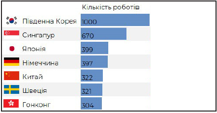 Проаналізуйте діаграму, на якій відображено рейтинг шести країн з найбільш автоматизованим виробництвом. Кількість роботів на 10000 робітників найбільша в тих країна, де спостерігають збільшення.