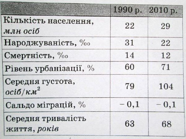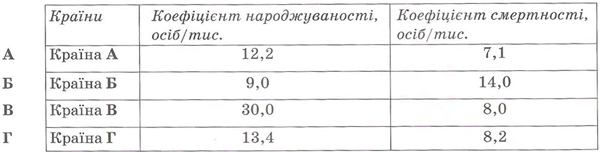 Проаналізуйте наведені в таблиці коефіцієнти народжуваності й смертності окремих країн світу й укажіть країну, у якій спостерігають явище депопуляції населення.