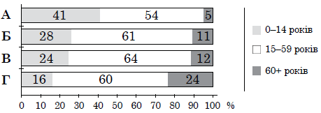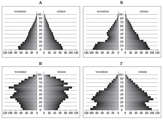 Проаналізуйте статевовікові піраміди чотирьох країн. Якою буквою позначено піраміду країни, уряду якої потрібно проводити демографічну політику стримування народжуваності?
