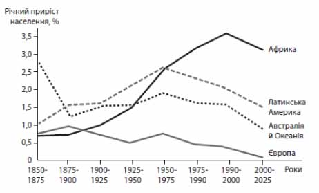 Проаналізуйте відображені на рисунку зміни показників природного приросту населення в окремих регіонах світу. Укажіть регіон, у країнах якого демографічна політика зменшення народжуваності в другій половині XX століття виявилася малоефективною.