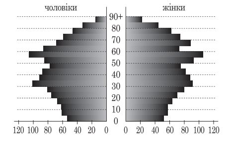 Прочитайте демографічний прогноз для країни N: «…низька народжуваність і висока тривалість життя можуть перетворити її на країну людей похилого віку. До 2025 року очікується зменшення населення на 7 млн осіб. Щоб забезпечити мінімальний приріст ВВП, уряду потрібно буде залучати щорічно до 100 тис. мігрантів». Визначте статево-вікову піраміду, що характеризує сучасну демографічну ситуацію в цій країні та є підґрунтям для такого прогнозу.