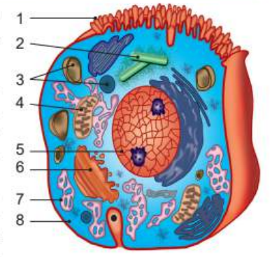 Встановіть відповідність між назвою органели (та відповідною її функцією) та цифрою, якою вона позначена: А) ядро (зберігає та передає спадкову інформацію); Б) клітинний центр (приймає участь в діленні клітини); В) мітохондрії (синтез АТФ та накопичення енергії); Г) лізосоми (розщеплення складних органічних сполук).