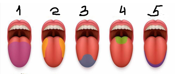 Встановіть відповідність між зоною язику відмічених на малюнку та смаком, рецептори яких розташовані в них: