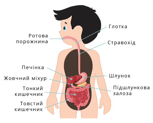 А - ротова порожнина Б - шлунок В - тонкий кішківник