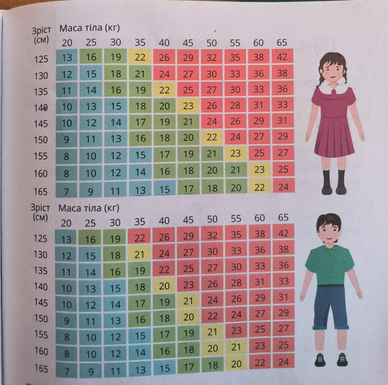 Зріст Матвія - 145 см, а його маса - 50 кг. На скільки кілограмів йому потрібно