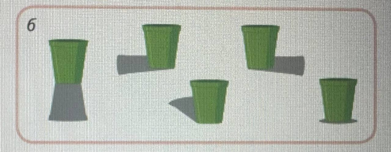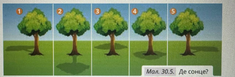 На малюнку зображено п’ять дерев з тінями. Де має бути сонце, щоб тіні були такими, як на малюнку?