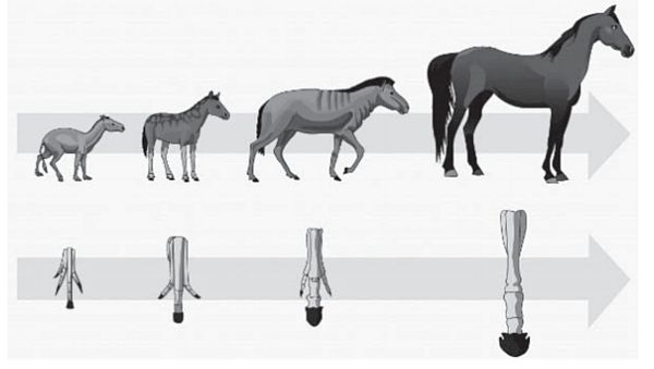 На малюнку зображено послідовність еволюційних змін передніх кінцівок у предків сучасних коней, що є підтвердженням