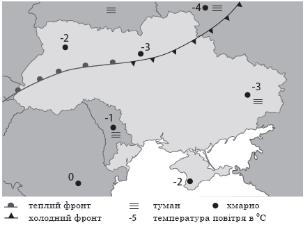 За фрагментом синоптичної карти визначте, у якій частині України спостерігатимуть підвищення температури повітря під впливом теплого атмосферного фронту.