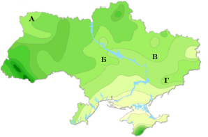 Проаналізуйте карту, на якій відображено відмінності на території України середньорічної кількості опадів (чим більша інтенсивність зеленого кольору, тим більше значення показника). Укажіть місцевість, де випадає найбільше опадів протягом року.
