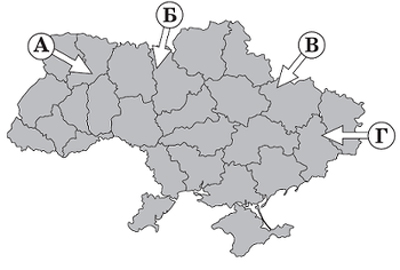 У січні на більшій частині території України ненадовго встановилася відносно тепла погода (від 0∘С до +4∘С) із мокрим снігом, що швидко танув. Якою буквою на картосхемі позначено напрямок переміщення повітряної маси, що зумовила таку погоду?