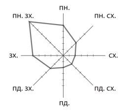 Розгляньте зображену на рисунку розу вітрів, побудовану за результатами спостережень за погодою в червні на одній з метеостанцій Волинської області.