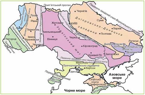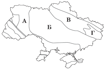 Визначте правильне поєднання тектонічної структури, форми рельєфу та видів корисних копалин на території України.