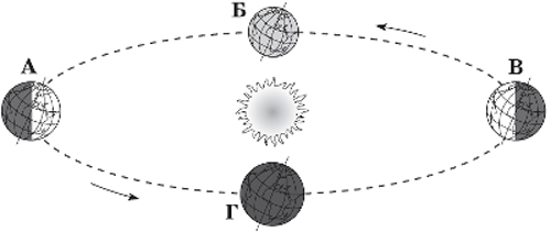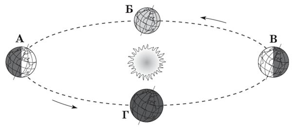 Земля рухається навколо Сонця з однаковим нахилом своєї осі (див. рисунок).