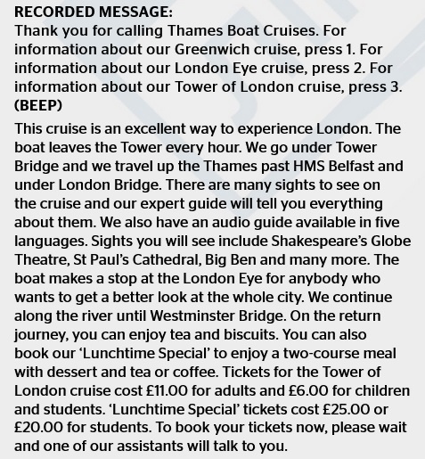X. Somebody is calling a travel agency and is listening to a recorded message about a cruise on the River Thames in London. Answer the question.