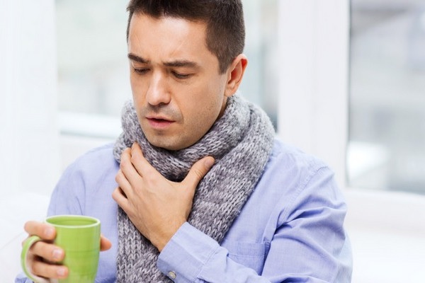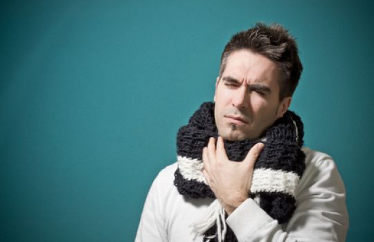 His hair is dark and short. He is wearing a red jumper.He has got a cough and a sore throat, so he put a warm striped scarf on his neck