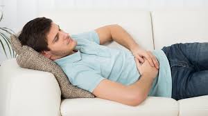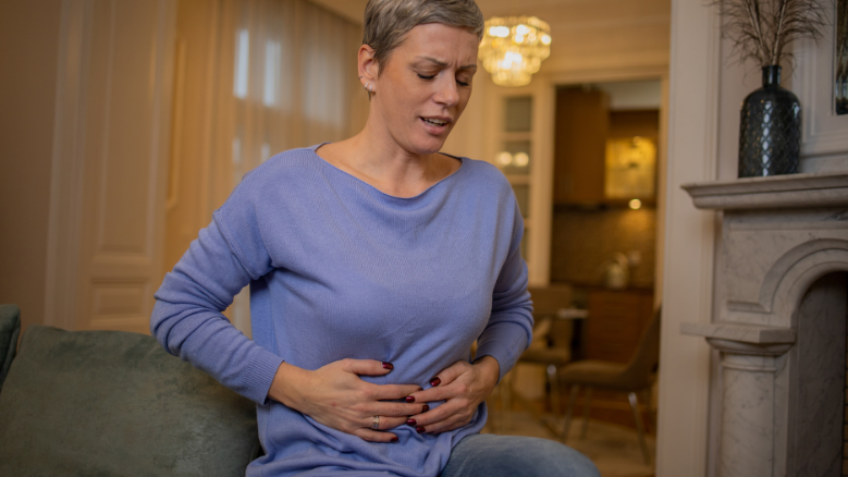 She has short blond hair, wearing a blue sweater. She ate a lot of fast food and now she has a stomachache.