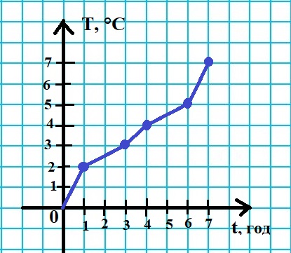 На графіку показано залежність температури від часу. Визначте на скільки градусів зросла температура з 3 по 7 годину?