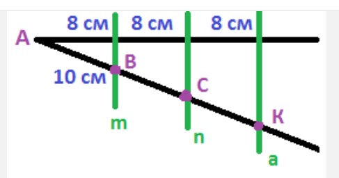 Паралельні прямі m,а, n перетинають сторони кута А. Використовуючи малюнок знайдіть довжину відрізка АК.