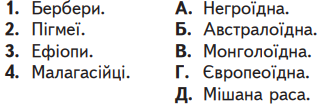 Визначте відповідність між народами Африки та їх належністю до людських рас.