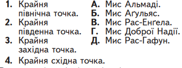 Установіть відповідність між географічним положенням та назвами крайніх точок Африки.