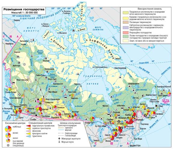 Проаналізуйте карту, оберіть позиції, які характеризують економіку Канади