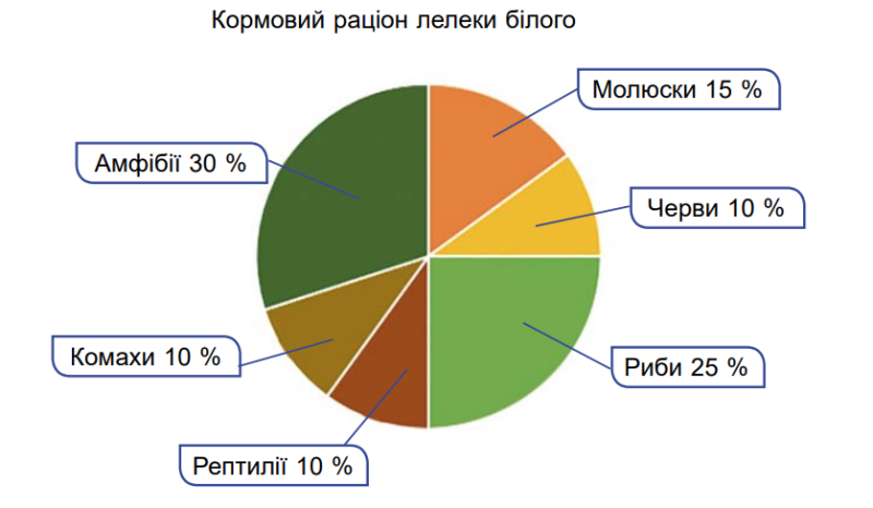Розгляньте колову діаграму кормового раціону лелеки білого. Виберіть твердження, які відповідають інформації, поданій на діаграмі.