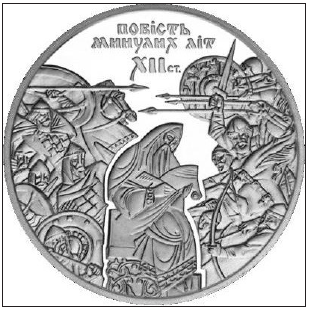 На фото зображено зворотний бік (реверс) монети, присвяченої видатній історико-літературній пам'ятці Русі-України. У центрі стилізованої композиції батальної сцени художник зобразив: