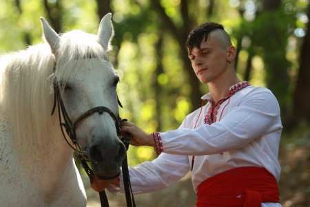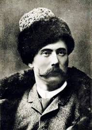 "...Одягнений у сюртук з куцими полами. Рукава з буфами, коло плечей ужчі,. а біля руки ширші. Штани широкі, трубою, коло чобота зовсім узенькі. Жилетка червона, двобортна, без манишки, з мідними пугвицями, шия пов’язана чорним шовковим платком"