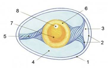 На малюнку будова яйця птаха цифрою 3 та 8 позначено: