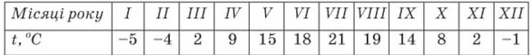 За даними таблиці визначте річну амплітуду середньомісячних температур повітря в одному з пунктів спостереження в Україні.