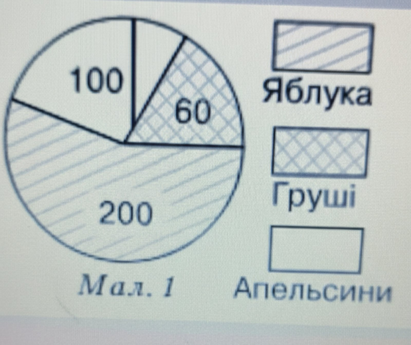 На малюнку зображено кругову діаграму фруктів. Скільки кілограм апельсинів?