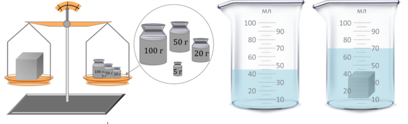 Досліджуючи густини різних речовин, Микита занурив чавунну деталь у мензурку з водою. Визначив об’єм деталі та виміряв за допомогою терезів масу. За даними малюнків розрахуйте знайдену Микитою густину чавуну. (2 бали)