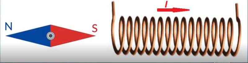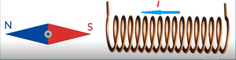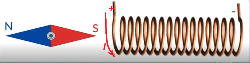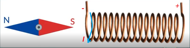 Поруч розташовані котушка та магнітна стрілка, як повернута до котушки південним полюсом. Визначте напрям струму в коотушці.