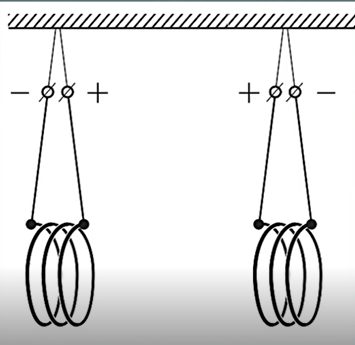 На тонких дротах підвішено дві котушки. як вони будуть взаємодіяти, коли через них почнуть пропускати електричний струм.