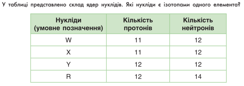 Скористайтеся малюнком. Які нукліди є ізотопами одного елемента? Вкажіть цей елемент. Дві відповіді.
