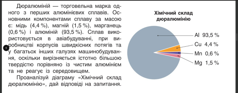 Скористайтеся малюнком. Обчислити масу домішок у зразку дюралюмінію масою 200 г. Оформлення задачі: Коротка умова , формули для розрахунку, розрахунок з одиницями вимірювання, відповідь. Фото розв'язку задачі надіслати