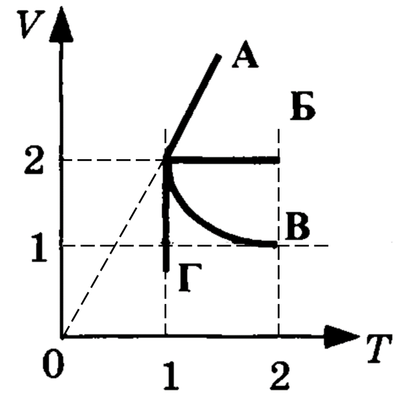 На VT–діаграмі наведені графіки зміни стану ідеального газу. Яка лінія графіка відповідає ізобарному процесу?