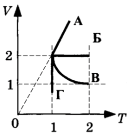 На VT–діаграмі наведені графіки зміни стану ідеального газу. Яка лінія графіка відповідає ізобарному процесу?