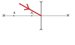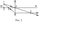 На рис. 2 показаний хід променів світла через лінзу, MN − головна оптична вісь лінзи. Яка з точок, вказаних на малюнку, є головним фокусом лінзи?