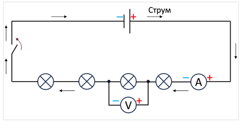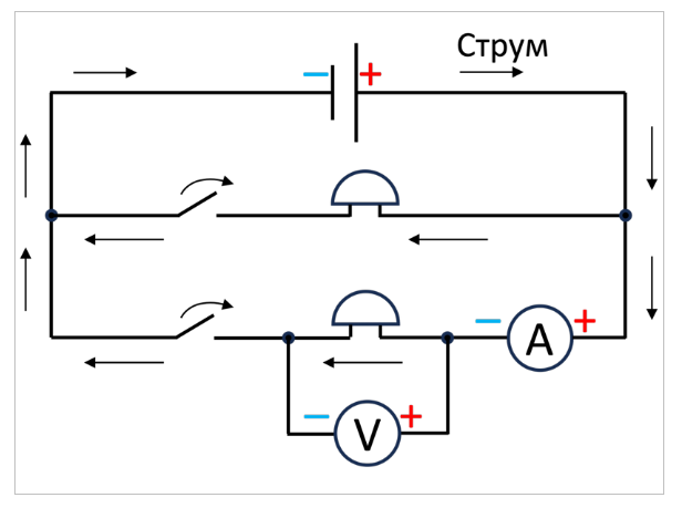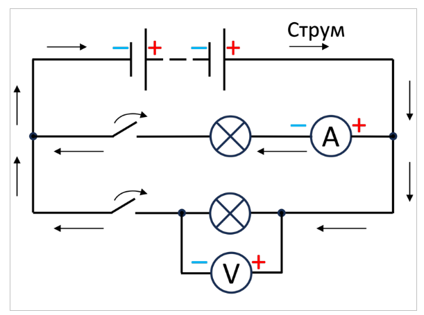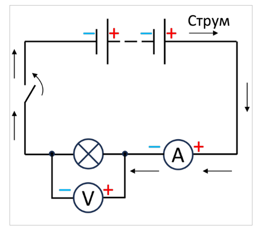 Виберіть схему кишенькового ліхтарика, до складу якої входять одне джерело струму (дві з’єднані батарейки), одна лампа та вимикач, на якій зображено всі елементи кола умовними графічними позначеннями: напрям електричного струму, підключення амперметра для вимірювання сили струму в колі та вольтметра для вимірювання напруги на лампі. ГР 1