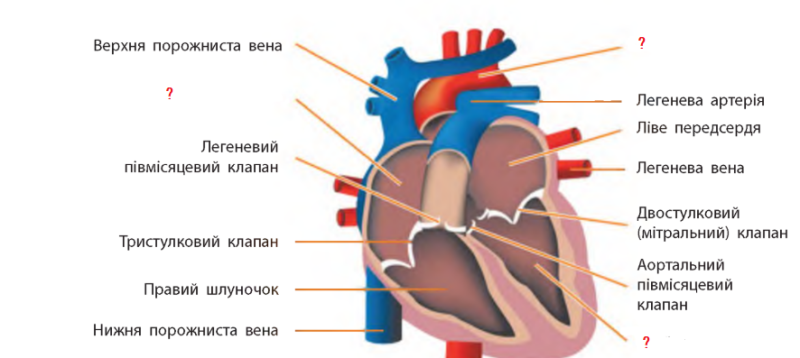 Позначте ВСІ елементи будови серця, який НЕ вистачає на картинці